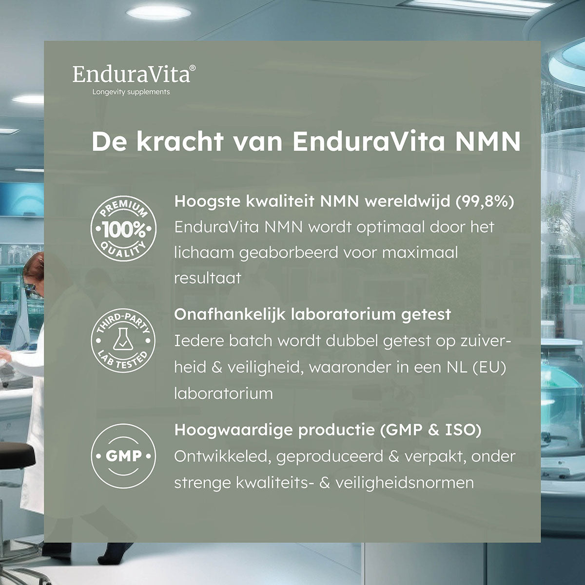 Il nostro NMN ha la massima purezza possibile di ben il 99,8%. Questo garantisce che venga assorbito perfettamente dal corpo. L'NMN di EnduraVita è prodotto secondo tutti i principali standard ISO relativi alla sicurezza. Inoltre, l'NMN è testato due volte nei laboratori per qualità, consistenza e sicurezza, incluso un laboratorio nei Paesi Bassi (UE).